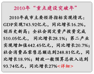市统计局发布2010年我市主要经济指标实现情况:GDP实现743.92亿元,同比增长16.2%,创历史新高;全社会固定资产投资完成510.05亿元, 同比增长28.1%;第二产业实现增加值442.45亿元,同比增长20.7%;社会消费品零售总额达到248.81亿元,同比增长18.9%;财政一般预算总收入达到93.74亿元,同比增长27%。第三产业投资增长迅猛。全年完成投资243亿元,总量接近工业性投资(245亿元),同比增长57%。其中,交通运输完成投资77亿元,同比增长84.4%。房地产开发投资完成59亿元,同比增长43.7%;商品房新开工面积同比增长102.6%,商品房销售面积同比增长57.7%。规模以上工业企业部分产品产量大幅增长。多晶硅产量达到4665吨,同比增长112.4%;人造板产量达到44.5万立方米, 同比增长78.4%;布产量达到5.6亿米,同比增长74.6%;纯碱产量达到85万吨,同比增长45.4%;瓷砖产量同比增长49.5%;鲜冷藏冻肉产量达到21.5万吨,同比增长35%。产量下降的产品有:铝,同比下降41.3%;农用化肥,下降37.6%;原盐,下降18.3%。另外,去年出口总额达到6.8亿美元,同比增长21.1%。