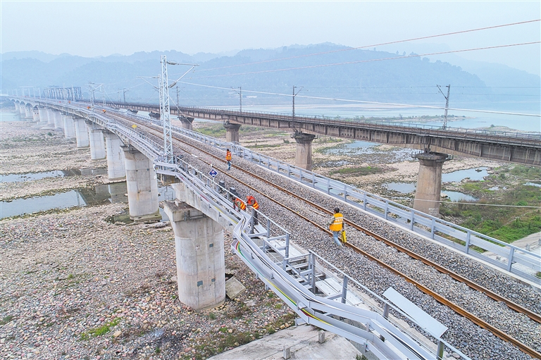 青衣江夹江段的江面上,一座特大铁路桥已经建起,这就是成昆铁路复线青衣江特大桥。并排而建的老成昆铁路青衣江特大桥上,伴随着车轮与铁轨摩擦的响声,不时有列车驶过。新老两座大桥并行横跨青衣江,显得非常抢眼。11月29日,记者在现场看到,大桥已基本建成,只有少部分工人在进行桥上电缆槽内安装工作。