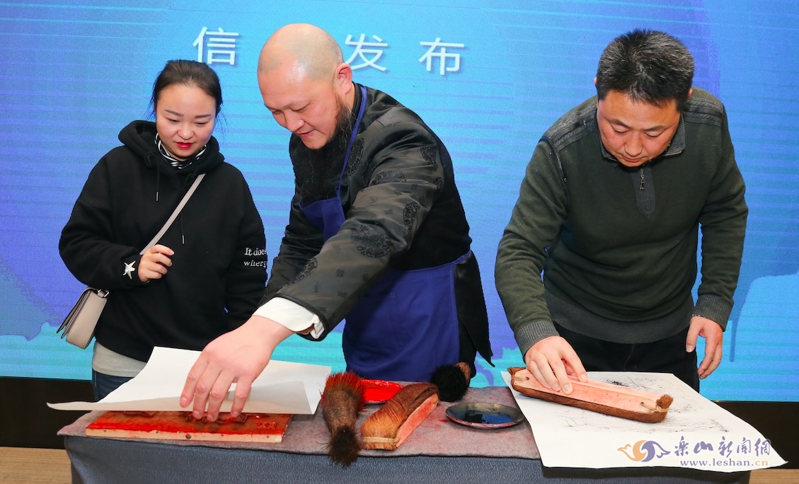 而除了美食之外,夹江年画、沐川草龙、蜀锦彝绣、彝族歌舞、大佛文创等集地方特色、文化创意于一体的乐山元素也脱颖而出,散发着古朴淳厚、绚丽多姿的历史幽香。发布会上,夹江年画传承人现场展示非遗技艺,吸引了不少与会嘉宾纷纷前来体验。