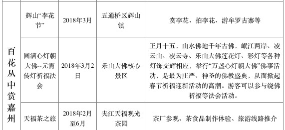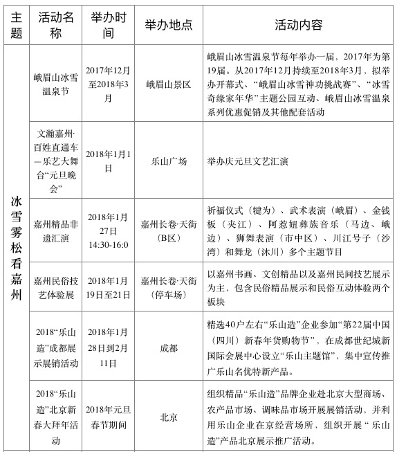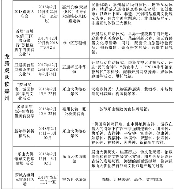 其中,一月举办的“冰雪雾松看嘉州”主题活动有:峨眉山冰雪温泉节、嘉州民俗技艺体验展、嘉州精品非遗汇演等,以冰雪峨眉、民俗非遗为主旋律,重点展示冬韵嘉州的美景、民风和民俗;二月“龙腾虎跃读嘉州”主题活动有:2018嘉州大庙会、动漫文化节、罗城古镇闹元宵系列活动等,以喜迎新春、群英荟萃为主线条,突出渲染春之嘉州的热闹非凡;三月“百花丛中赏嘉州”主题活动有:辉山李花节、天福茶之旅、犍为花季之旅等,以赏花观景、漫山春色为主画面,集中呈现花满嘉州的壮观场面。