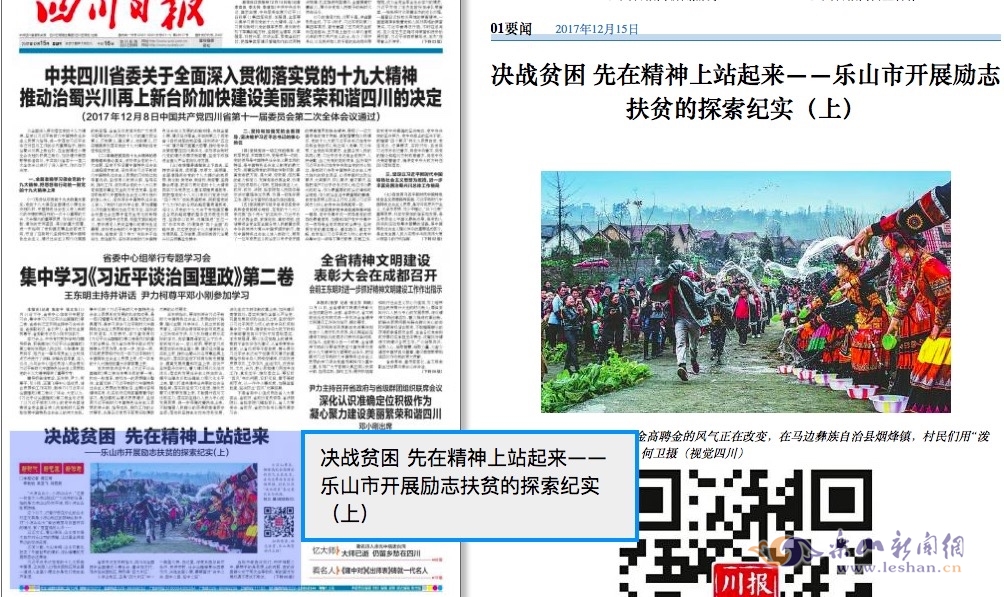 15日,四川日报在01版,以《决战贫困 先在精神上站起来——乐山市开展励志扶贫的探索纪实(上)》为题,对乐山励志扶贫工作进行了详细报道。说故事、讲事例、道做法……文章从“身边故事会”传递榜样力量、“负所得税”试点引领价值取向、“教育促进计划”构筑长久基石等三个方面入手,全方位、多角度地讲述了乐山脱贫攻坚典型经验。