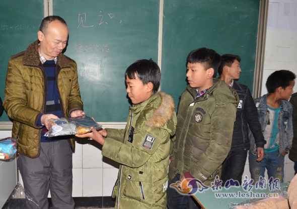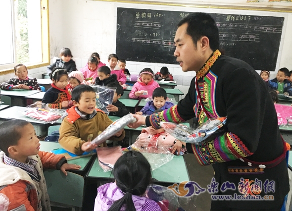 大竹堡乡白岩湾村“第一书记”梅鹏将御寒物品送到孩子们手中