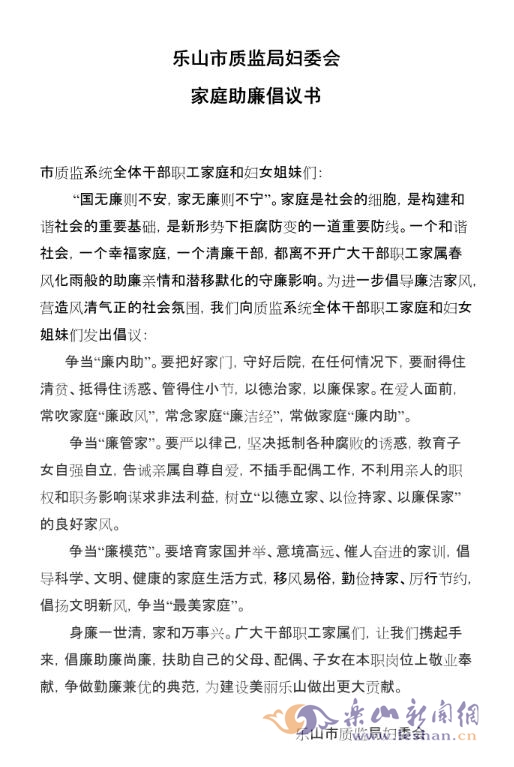 三是发出“家庭助廉”倡议书。利用质监QQ工作群、微信工作群,向质监系统全体干部职工家庭发出倡议。倡导全体干部职工家庭和妇女姐妹们要做好“廉内助”,当好“廉管家”,争当“廉模范”,共筑廉洁温馨的家庭港湾。下一步,我局将与领导干部职工家属签订“家庭助廉”承诺书,引导家庭成员绷紧廉政之弦,形成家庭助廉、倡廉、守廉、尚廉的好风气。