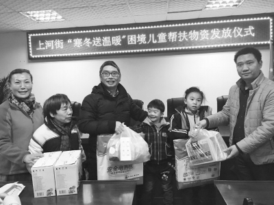 本报讯(记者张波摄影报道)为帮助辖区困境儿童克服困难,健康成长,16日上午,市中区上河街街道办事处开展了“寒冬送温暖”物资发放活动,辖区收到了自己的暖冬礼物。