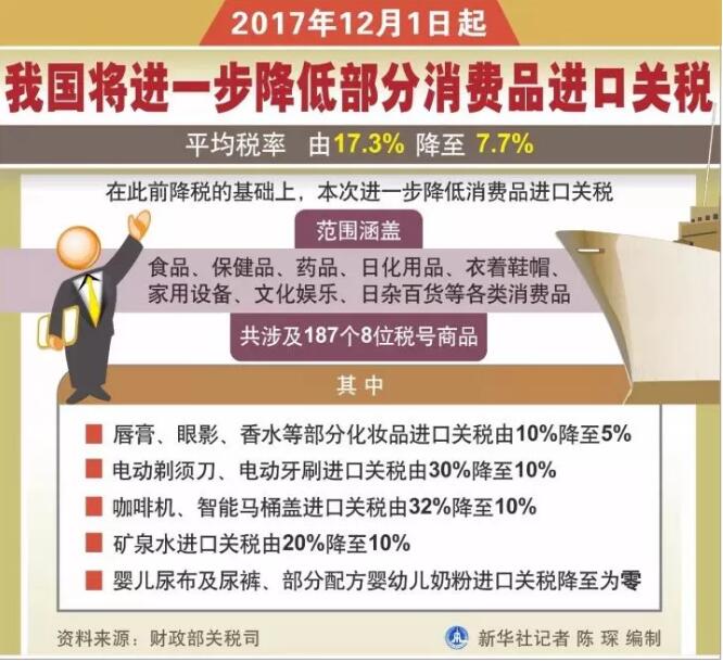 财政部近日发布消息,从12月1日起,我国将进一步降低部分消费品进口关税,平均税率由17.3%降至7.7%。