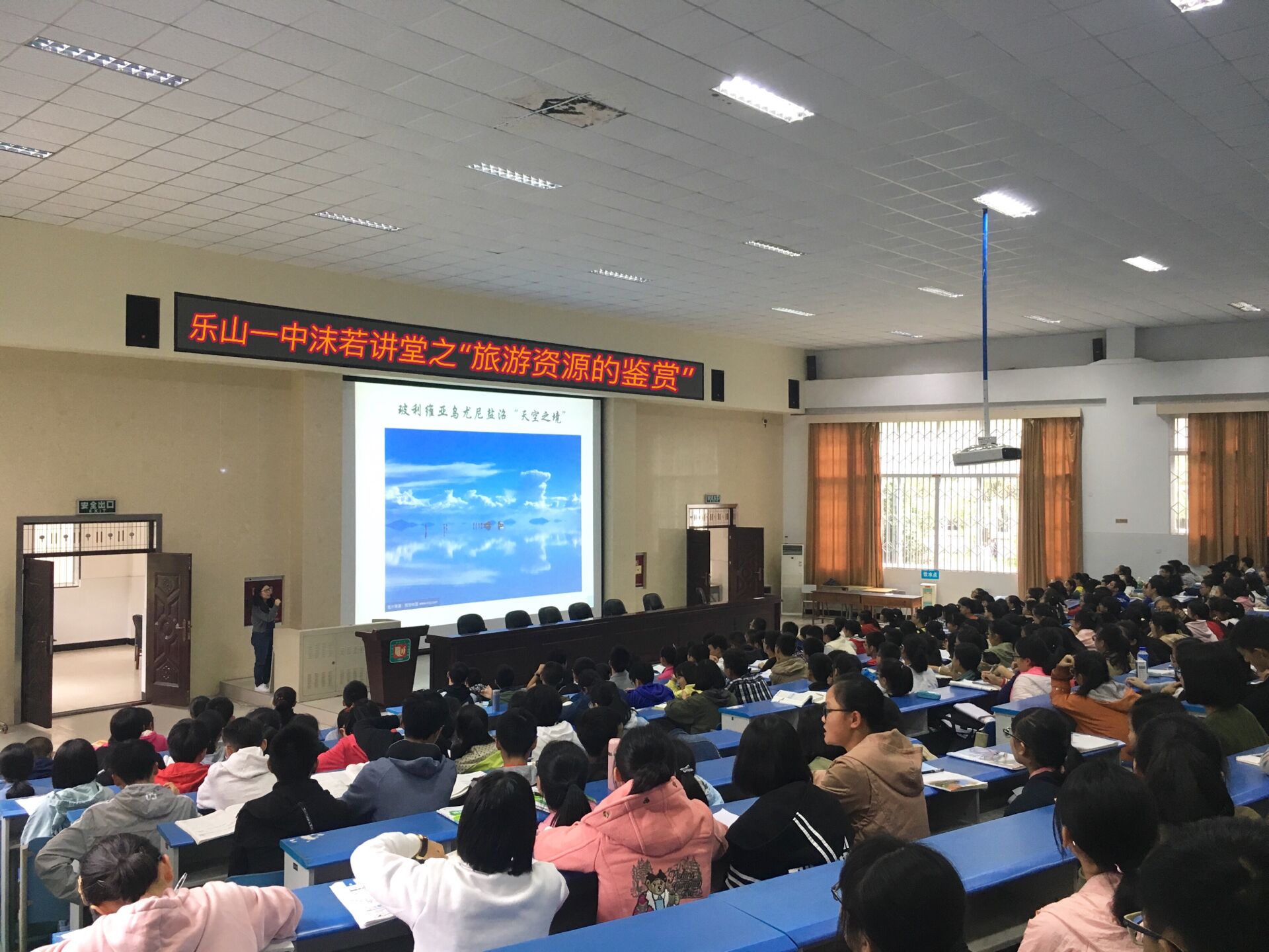 10月18日下午,乐山一中“沫若讲堂”系列主题活动(三十)——“旅游资源的鉴赏”在第一学术厅顺利开展。“沫若讲堂”是同学们的第二课堂,由各备课组定期举办。在讲座中同学们可以放松身心地去感受文学的多彩、科学的奇妙、自然的美丽。本期活动由高2020届地理备课组承办,主讲嘉宾为地理组张诗翊老师。