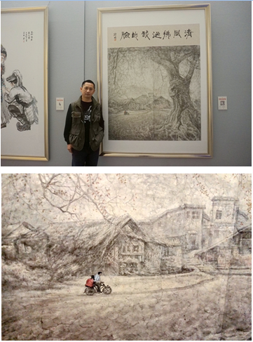 我校美术教师沈显威入选此次主题展的国画作品《清风拂过我的脸》,以美丽乡村为主题进行创作的。这幅作品是沈显威老师在暑假回故乡五通桥牛华古镇写生素材的基础上创作而成的,他用笔墨描绘了初秋古镇上的古树、老宅、骑单车的恋人,深情吟颂了故园美景。