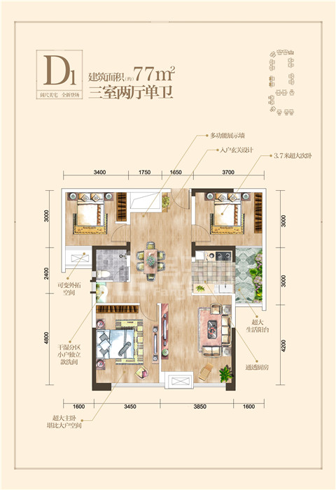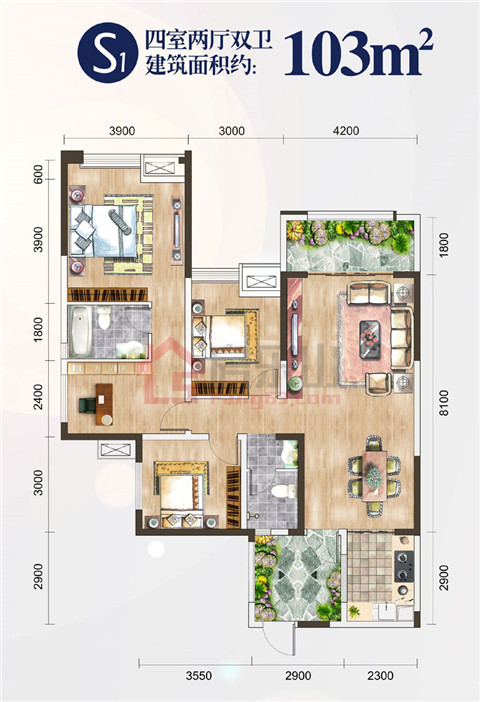 户型点评:此房位于12号楼,户型可看前面22000㎡大中庭。阔尺四室,户型方正大气,活动空间宽敞。此户型带入户花园和观景阳台,观景自如,生活品质非常高;餐厅、厨房紧紧相连,用餐、烹饪极其方便;4.2米大客厅开间,活动面积较大,会客亲朋都能非常自由;户型的典型的干湿、动静分区,居住舒适度较高。四室设计,书房、客房、次卧、主卧一应俱全,舒适生活由此展开。(注:现S1户型有实体样板间可参观,供大家品鉴)