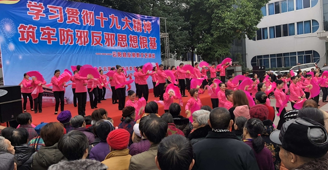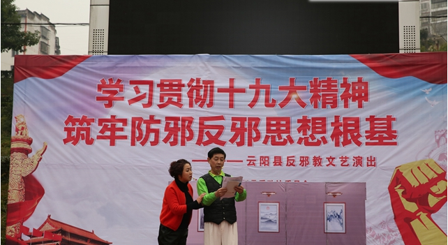 在南溪镇活动现场,以“学习贯彻十九大精神,筑牢防邪反邪思想根基”为主题,文艺演出队演唱了歌曲《远离邪教祸根根》、快板舞《痛斥邪教害人精》、群口方言《邪教害死人》等节目,通过这些生动的节目演出,让群众真正了解邪教组织的本质危害,告诫居民提高警惕,树立热爱科学、崇尚科学、反对迷信、远离邪教的意识。