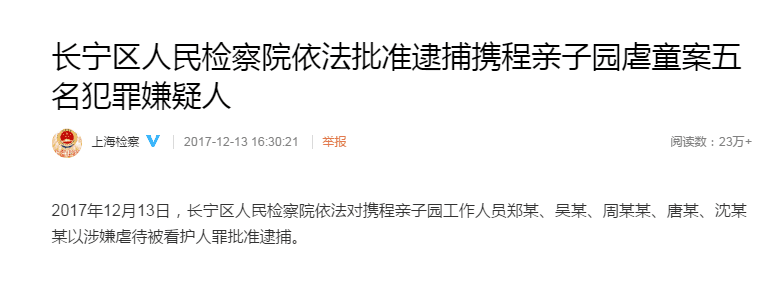 人民网上海12月13日电 2017年12月13日,长宁区人民检察院依法对携程亲子园工作人员郑某、吴某、周某某、唐某、沈某某以涉嫌虐待被看护人罪批准逮捕。(王文娟)