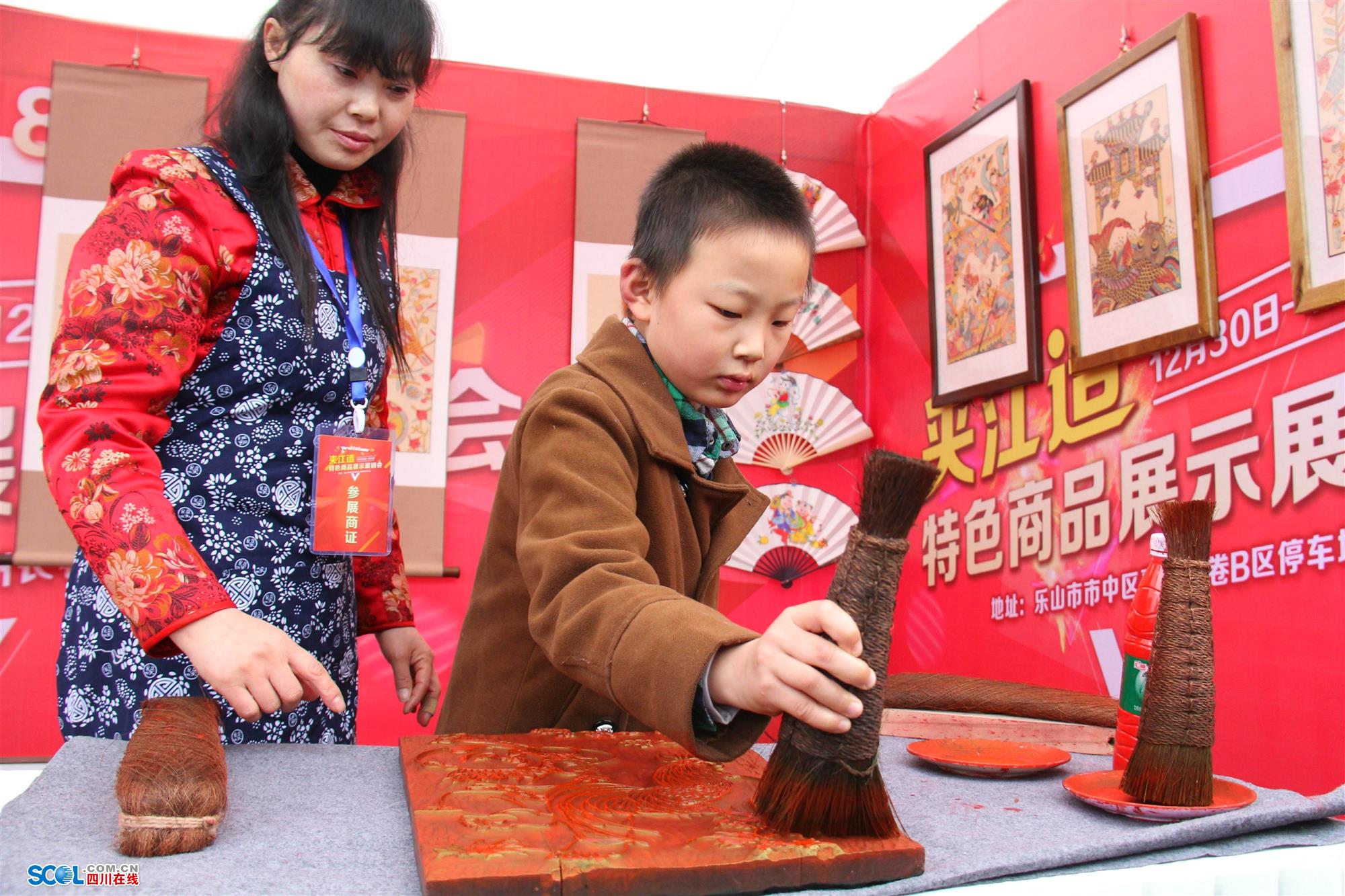 夹江年画起于明代,传承发展至今,历史悠久,与绵竹年画、梁平木板年画并称“四川三大年画”。其内容取材民间,丰富多彩,具有珍贵的历史文化价值和艺术贡献价值。夹江年画久负盛名,乐山市民余女士特地带着8岁的儿子,来到展销会体验制作夹江年画。“今天能够让儿子亲手制作一张夹江的传统木板年画,感受传统文化,很有纪念意义。”