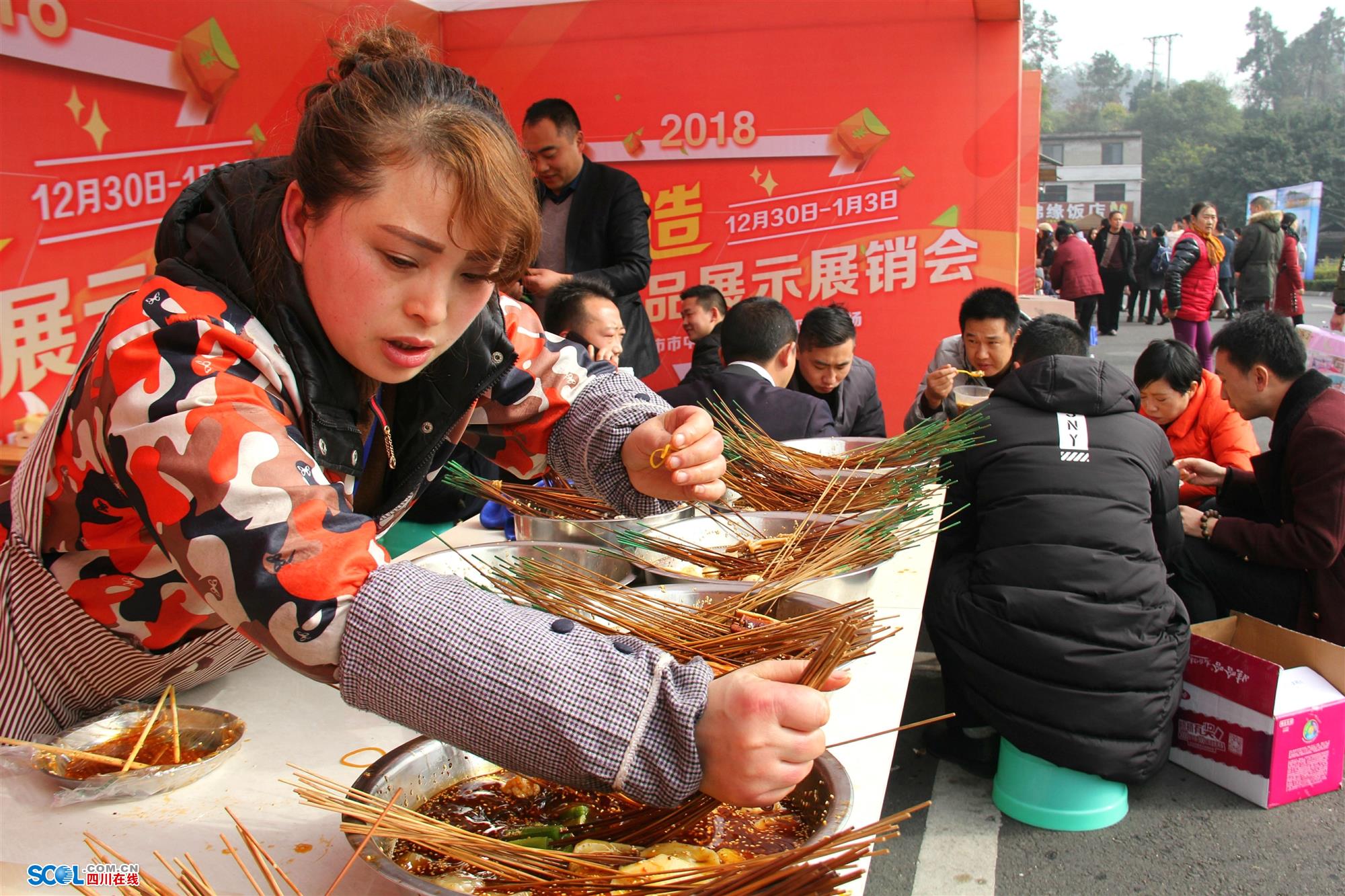 美食展区汇聚了峨眉山月花园饭店、四川省志强泡海椒责任有限公司、夹江县清江酿造厂、夹江县徐氏鹿肉产品加工坊等15家当地行业内颇具代表性的企业。游客们不仅可以品尝到容孃棒棒鸡、郑记冷串串等夹江特色美食,购买到夹江豆腐乳、志强泡海椒、千瓷缘酒等特色产品。