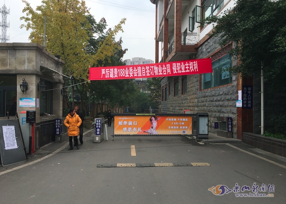 位于峨眉山脚下的188官邸小区别有一番宁静,可小区门口一幅挂有“严厉谴责188业委会擅自签订物业合同 侵犯业主权利”的红色横幅,却与之有些格格不入。11月29日下午,记者来到该小区,不少业主正聚在一起,对业委会更换物业之事怨声连连。