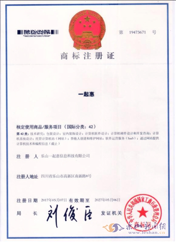 “一起惠”获得的商标注册证
