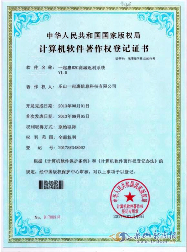 “一起惠”获得的计算机软件著作权登记证书