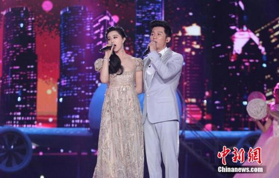 资料图:2015浙江卫视跨年晚会,范冰冰、李晨深情对唱狂“虐狗”。 图片来源:视觉中国