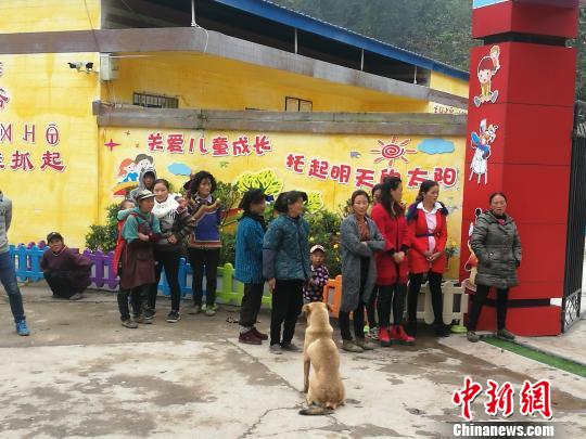 图为峨边彝族自治县白杨乡瓦洛村阿依园等待接孩子放学的家长。 杨珺 摄