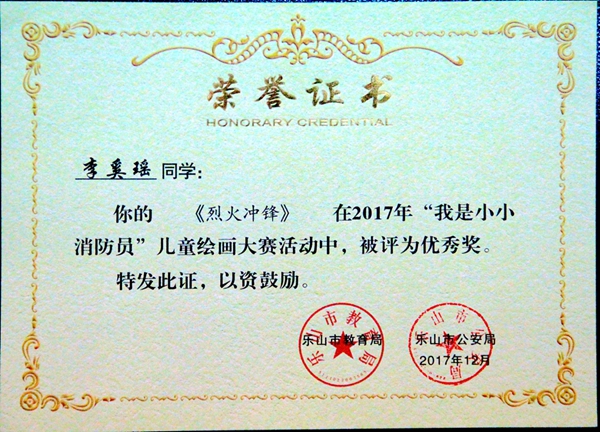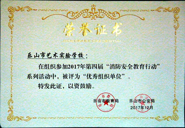 在组织参加的2017年第四届“消防安全教育行动”系列活动中,乐山艺术实验学校被评为“优秀组织单位”!