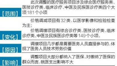 此次调整的医疗服务项目涉及综合医疗服务类、医技诊疗类、临床诊疗、中医及民族医诊疗类四个大项181个小项,既有价格调增的,也有价格调减的。调减项目有32类,以医学影像和检验检查为主;调增项目有综合诊疗类、医技诊疗类、临床诊疗类、中医及民族医诊疗类等149个小项。