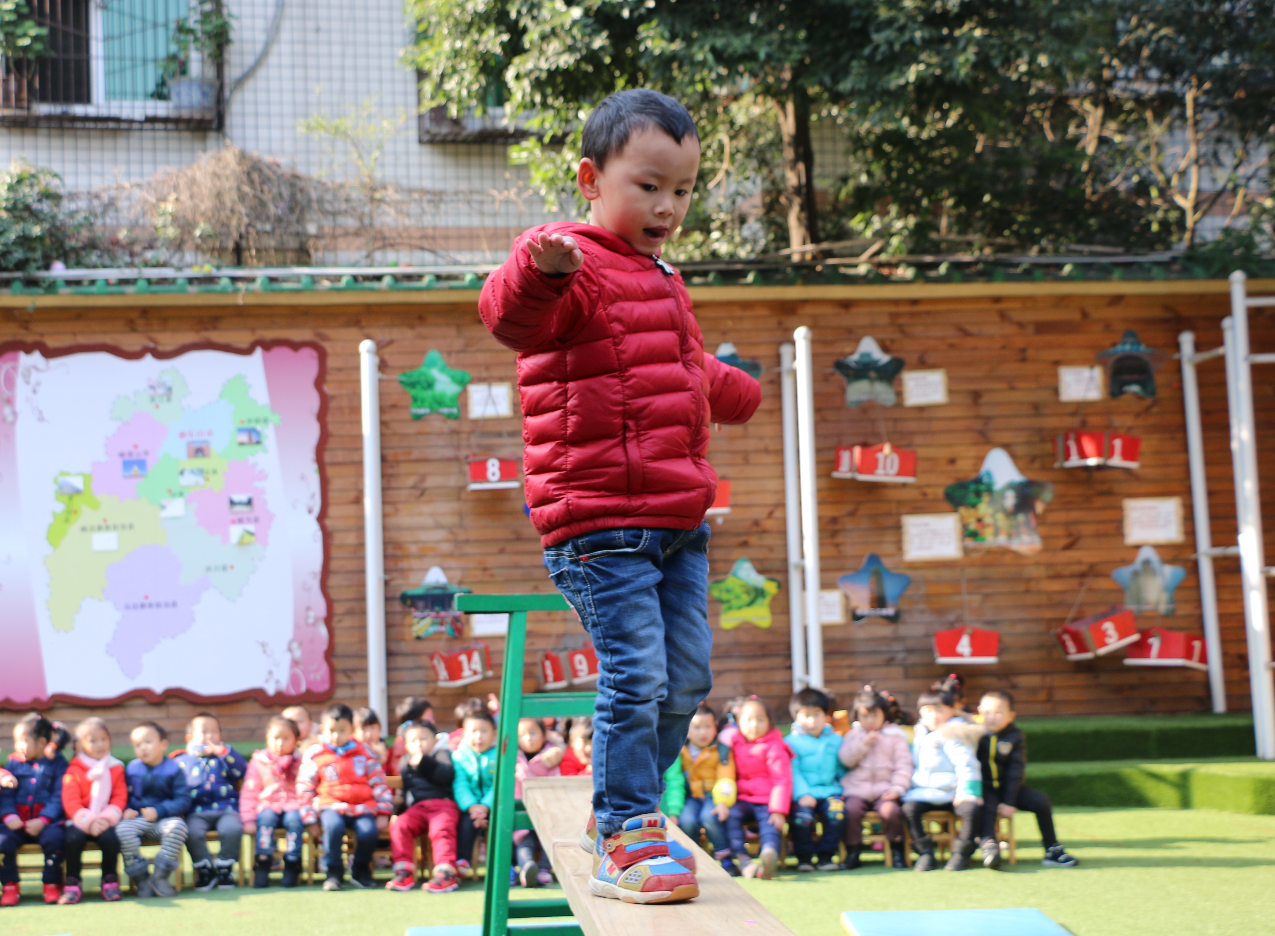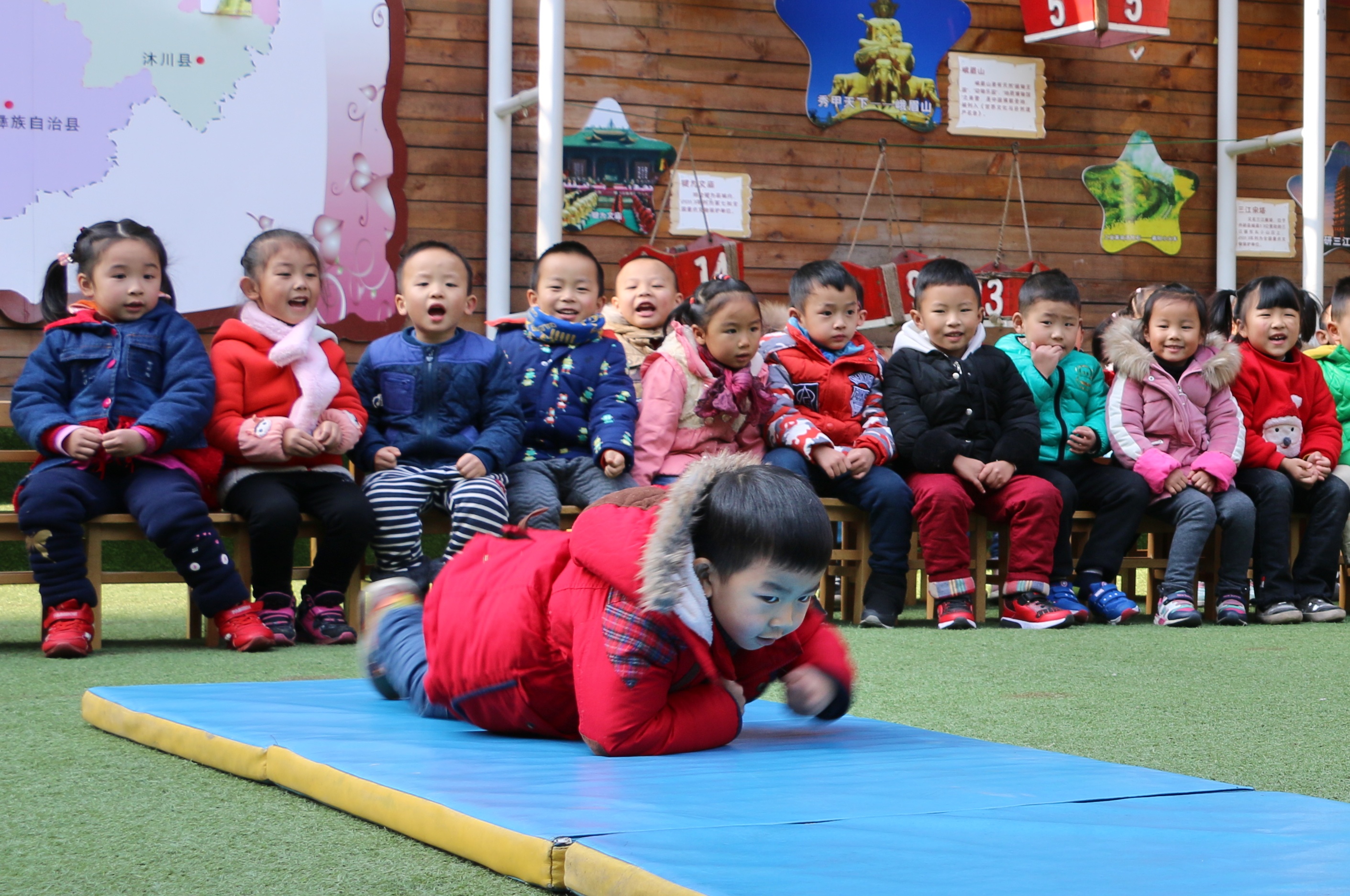 2017年12月19日下午,继上周原地运球比赛后,市机幼中班的孩子们迎来了属于他们的运动技能大赛,比赛中孩子们展示了匍匐前进、攀爬、平衡、跳跃等技能。活力四射的热身操给你们瞅瞅,这才是正宗的匍匐前进!这小梯子,轻轻松松就能爬上去.飞檐走壁我去去就来.请问在坐的各位还有谁不服?